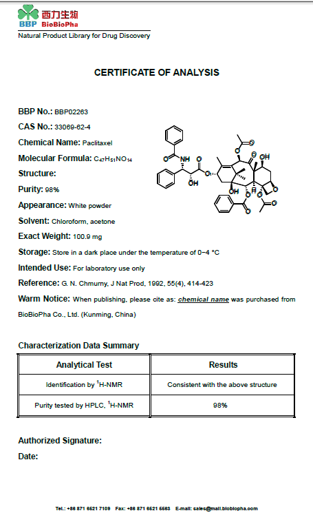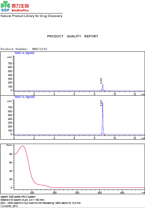 At BioBioPha, the determination of the structures is carried out mainly by Nuclear Magnetic Resonance spectroscopy (NMR) while the purity is determined by the High-performance liquid chromatography (HPLC) supplement with NMR. Our customers can find the conclusions of identification in Certificate of Analysis (COA).